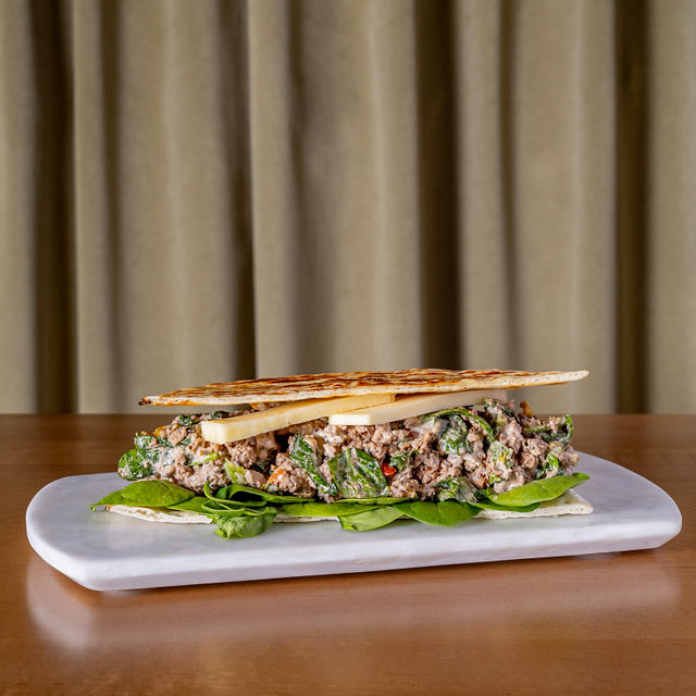 BOITE À LUNCH Pain pita, homard, crevettes, échalotes, poireaux, bébé épinards, aïoli, cheddar fort.